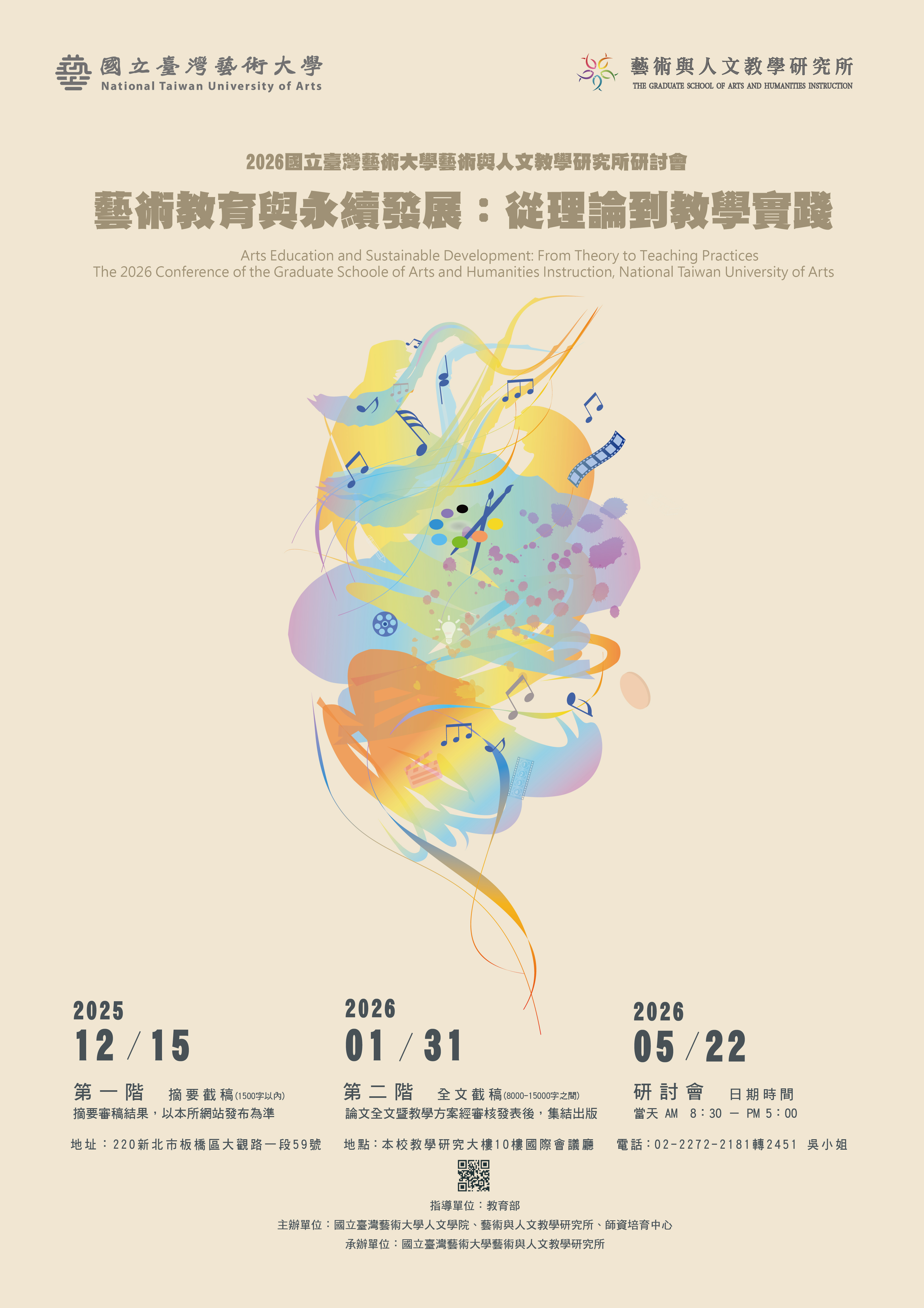 一、旨揭研討會由本校藝術與人文教學研究所承辦,訂於115年5月22日(星期五)上午8時至下午5時,於本校教學研究大樓10樓國際會議廳舉行。 二、全程參與者將核發研習時數。 三、隨函檢附研討會計畫內容暨活動海報,後續資訊請參閱公告網址:https://gahi.ntua.edu.tw/