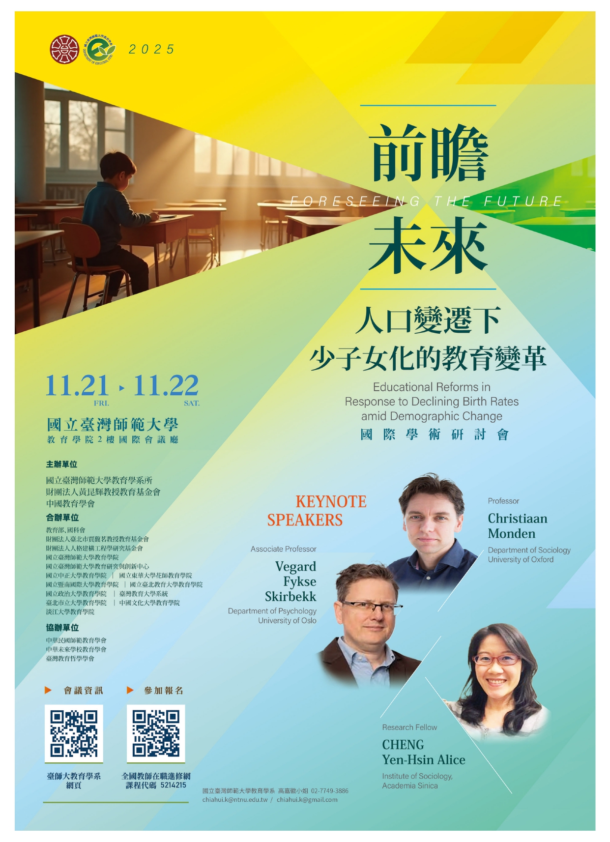 一、國立臺灣師範大學教育學系所與財團法人黃昆輝教授教育基金會、中國教育學會共同辦理「前瞻未來:人口變遷下少子女化的教育變革」國際學術研討會。